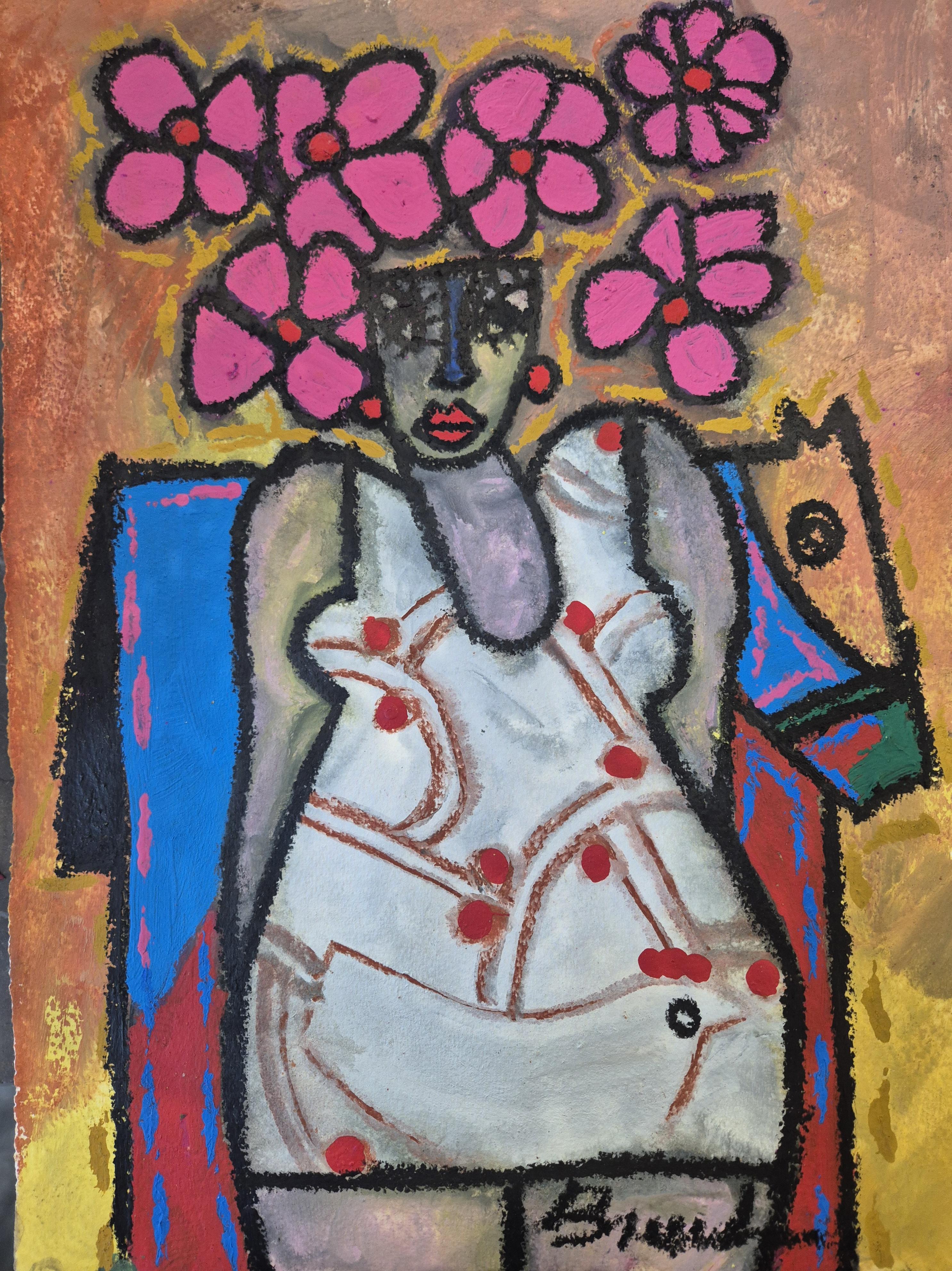 Most of Breceda’s artwork is COBRA-style, mixed-media on paper. His works share an intensity in the color schemes, a thrust in the brush work, an energy bordering on fierceness and sternness